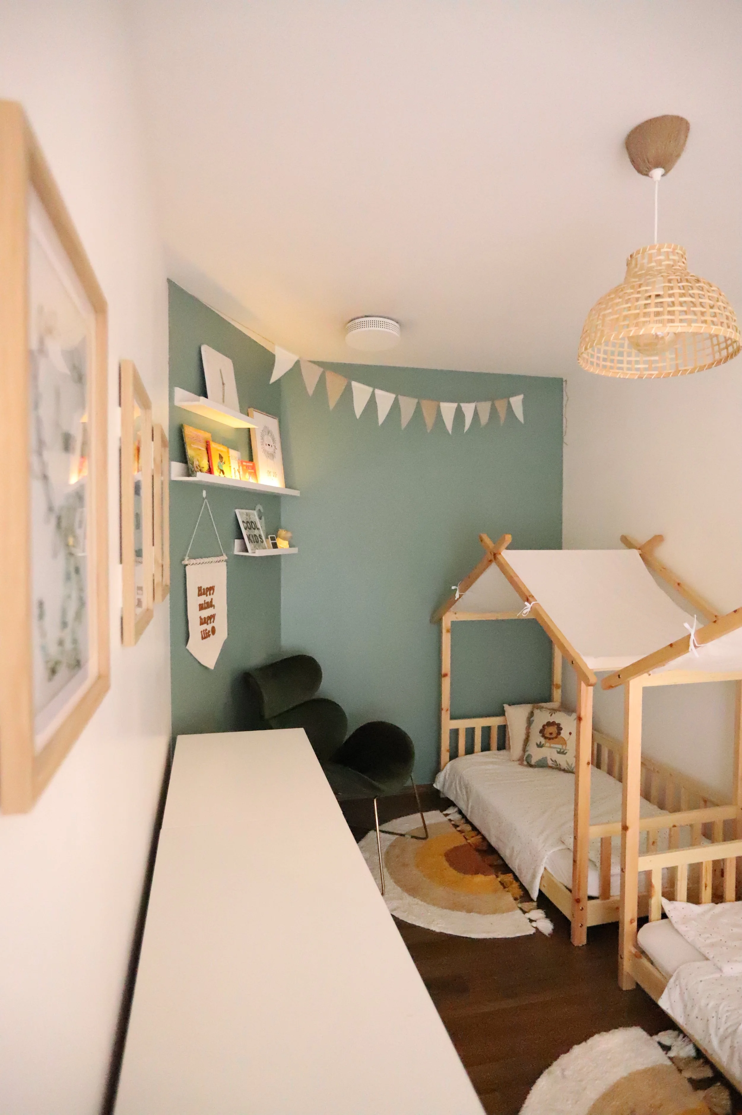 Création d’une chambre à partager et mixte. La cliente souhaitait une atmosphère chaleureuse dans des tons doux et vintage. Il fallait faire évoluer l’univers d’un bébé qui apprend à marcher et créer un espace pour le bébé à venir.